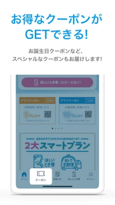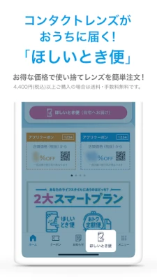 物理的な会員カードを探す手間はもう不要です。お使いのスマートフォンがそのまま会員証として機能し、店舗でのご利用をよりスムーズにします。また、アプリを通じて特別な割引クーポンを定期的にお届け。お誕生日月には特別なサプライズもご用意しており、お得な機会を見逃しません。さらに、自宅で手軽にコンタクトレンズを補充できる「ほしいとき便」は、使い捨てレンズの再注文をシンプルにし、税込4,400円以上のお買い物で送料・手数料が無料となるため、賢く、手間なく毎日をサポートします。