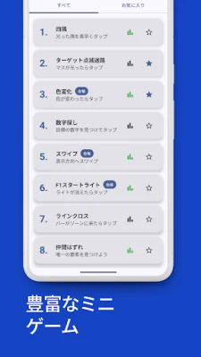 「反応速度テスト&反射神経を鍛える集中力脳トレゲーム」には、あなたの脳を多角的に刺激するユニークなエクササイズが満載です。F1レーサーのスタートダッシュを模した「F1スタートライト」で正確なタイミングを磨き、色と文字の錯覚を利用した「色当て」で情報処理速度を極限まで高めます。動くターゲットを追う「動くボール」で目と手の協応を、グリッドから異なる要素を探す「仲間はずれ」で鋭い注意力と瞬間的な判断力を養いましょう。他にも、思考と指の連動を試す「スワイプ」や、瞬時の比較判断が求められる「二つのテーブル」など、多様なモードが脳の敏捷性と精度を同時に高めるよう緻密に設計されています。