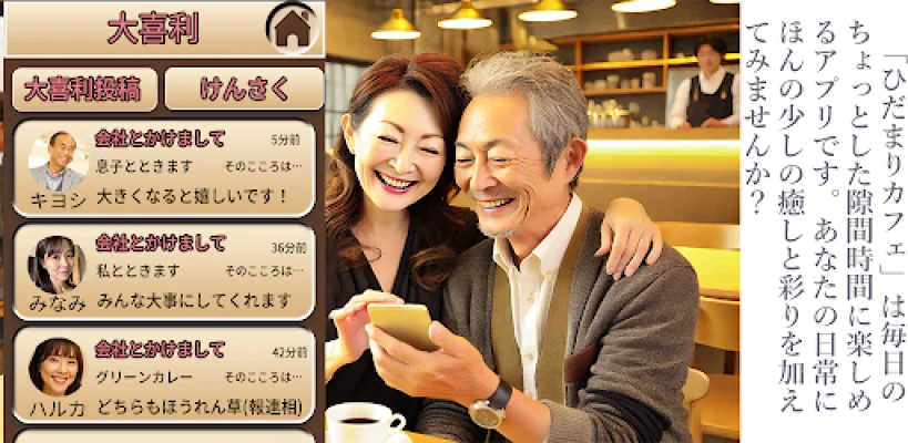 ひだまりカフェでは、旅行、料理、健康、ガーデニング、読書といった多岐にわたるテーマを通じて、共通の興味を持つ仲間と簡単に出会えます。シンプルな画面設計で、オンラインでの交流が初めての方でも安心して始められるのが特長です。趣味のグループで自由に語り合い、新たな発見や喜びを分かち合うことで、日々の生活に彩りが加わります。メッセージ機能を使えば、気の合う相手とより深く、プライベートな会話を楽しむことも可能です。
